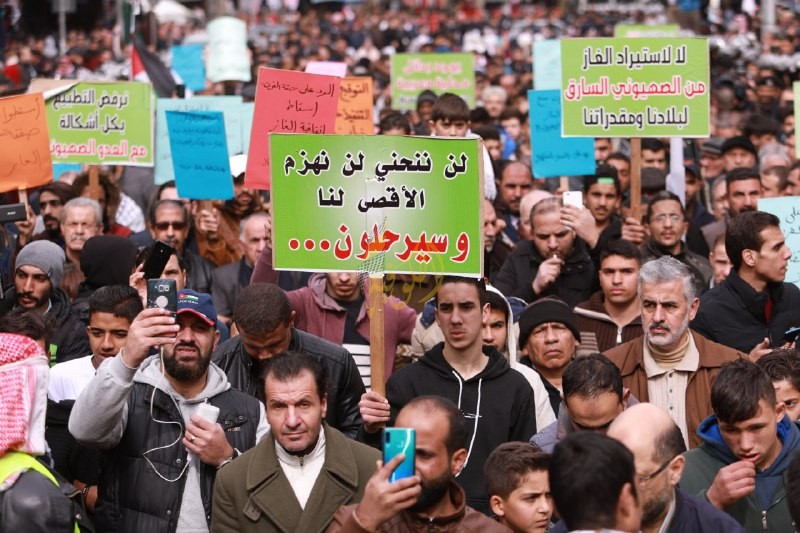 وانطلقت مسيرة شعبية حاشدة بعد صلاة الجمعة من أمام المسجد الحسيني وسط العاصمة الأردنية عمّان؛ رفضًا لـ"صفقة ترامب" التي تهدف لتصفية القضية الفلسطينية.