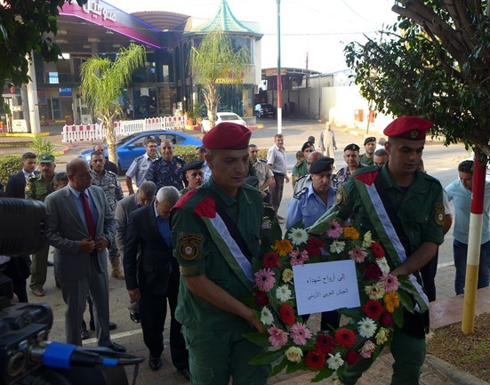 وذكر البيان أن للواء أكرم الرجوب محافظ محافظة ونائبه عنان الأتيرة يرافقه نائب مدير شرطة المحافظة العقيد باسم جبارة وقائد منطقة نابلس ضمن وفد ضم العديد من المؤسسات الرسمية الأمنية والمدنية والهيئات المحلية قاموا بوضع إكليل الزهور على النصب التذكاري للشهداء تلاها قراءة الفاتحة على أرواح الشهداء.