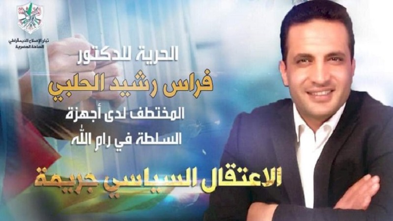 مضيفاً أن الدكتور فراس رشيد الحلبي هو نموذج مشرف، عمل معه خلال سنوات دراسته في مصر، وأثبت أنه مثال يحتذى به وطنياً وأخلاقياً وعلمياً فكان خيرُ سفير لوطنه وأهله في الغربة، وعلى ما يبدو أن هذا سلوك لا يروق لمعتقليه، حيث قام جهاز الأمن الوقائي منذ أيام بإختطافه من جسر الكرامة أثناء عودته لاستكمال رحلته العلمية.
