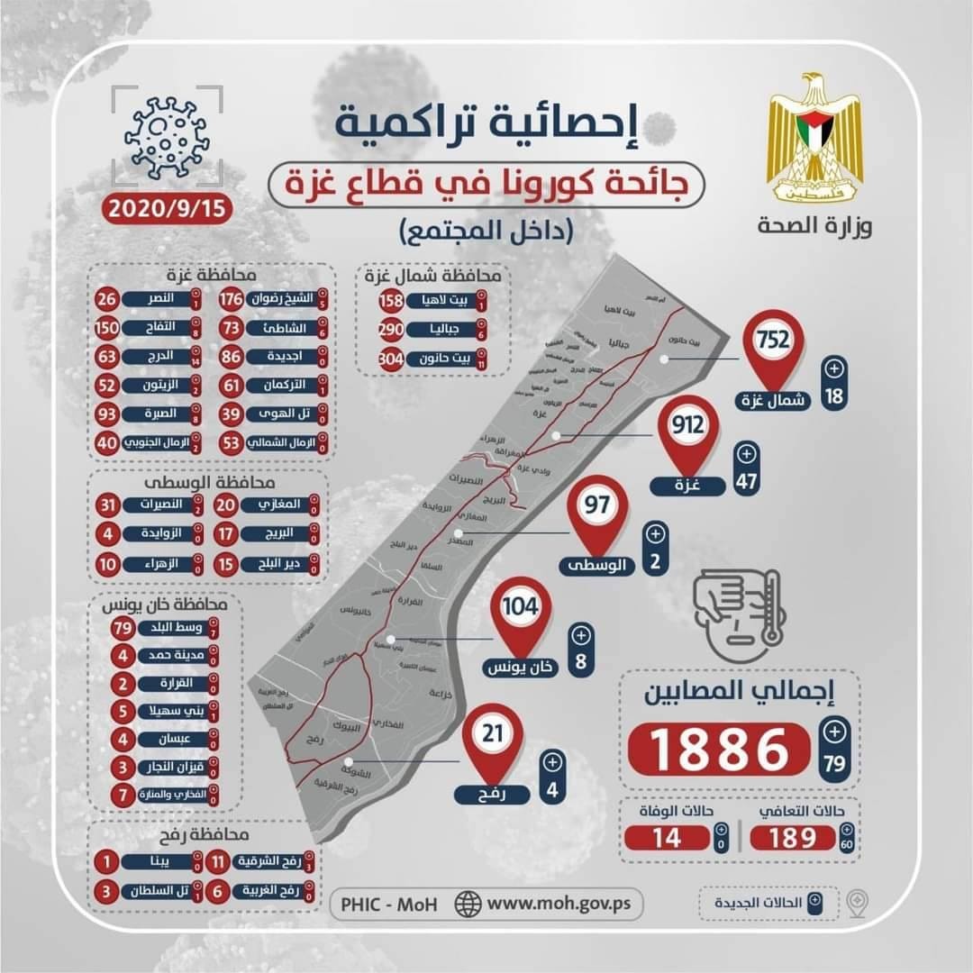 وبينت الصحة في الإحصائية التراكمية حول جائحة كورونا، أن "إجمالي الإصابات 1886، منها 752 شمال القطاع، 921 في غزة، 97 في الوسطى، 104 في خانيونس، 21 في رفح".