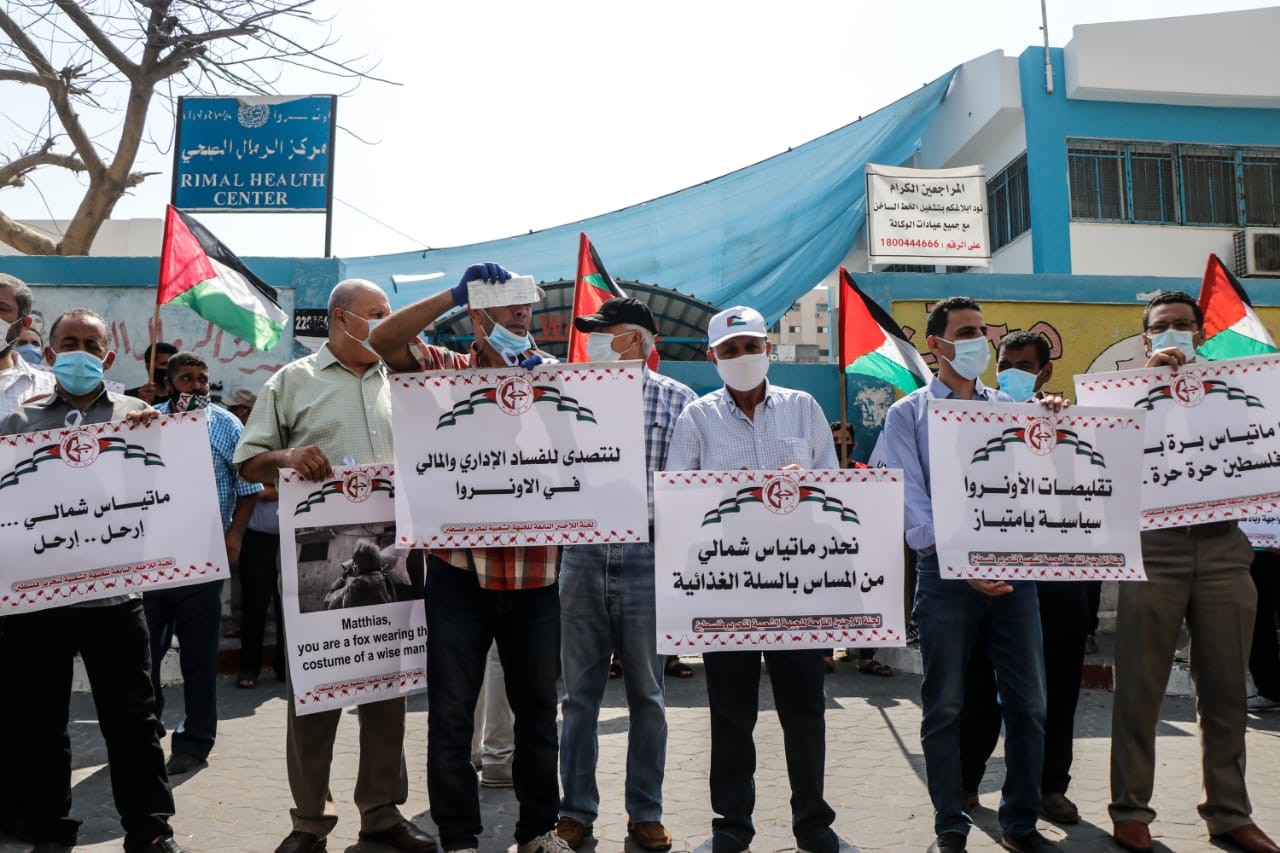 ورفعت في الوقفة شعارات باللغتين العربية والانجليزية، منددة بسياسات الأونروا، وبالدور الذي يقوم بها مدير عمليات وكالة غوث وتشغيل اللاجئين في غزة ماتياس شمالي.