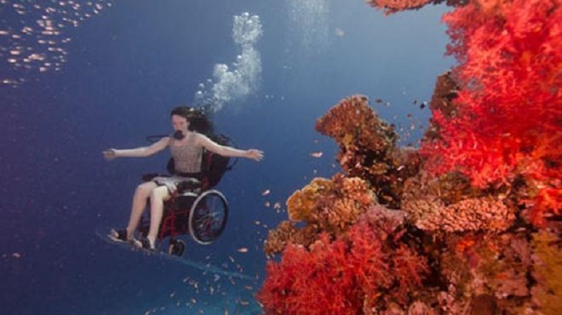 لندن: الإعاقة ليست إعاقة الجسم، فالمستحيل ممكن تحقيقه بالإرادة والمثابرة والأمل، حيث تحقق حلم "سو أوستن" البريطانية في الغوص، وهي تعاني من إعاقة في الحركة، بينما كانت في حالة من السعادة والفرح تغمرها بنزولها تحت الماء ومشاهدة الأسماك والشعب المرجانية حولها، وهي جالسة على كرسي متحرك تحت الماء صنع خصيصا بعوامات وزعانف للغوص ويتم التحكم فيه بالقدم.