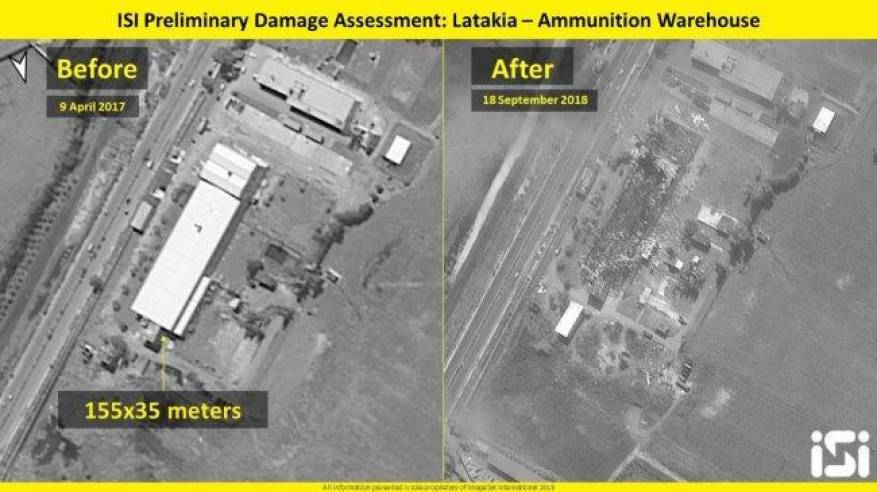 القدس  المحتلة: نشرت شركة "إيميج سات" التجارية، صورًا التقطت من قمر صناعي، أظهرت دمارا كاملا فيما تسميه "إسرائيل" مخزنًا للأسلحة استهدفته مؤخرًا طائراتها في الهجوم على اللاذقية.