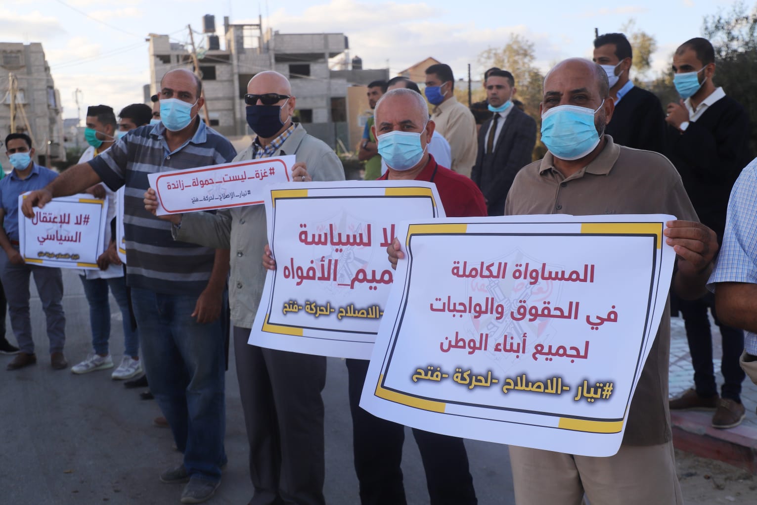 ورفع المشاركون في الوقفة لافتات كتبوا عليها "ولدتنا أمهاتنا أحرارً"، و"المساواة الكاملة في الحقوق والواجبات لجميع أبناء الوطن"، و"لا لسياسة تكميم الأفواه"، و"غزة ليست حمولة زائدة".