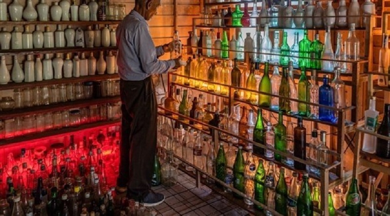 وصُفّت هذه الزجاجات الآتية من حول العالم بأشكال وأحجام مختلفة على رفوف وعلى الأرض.
