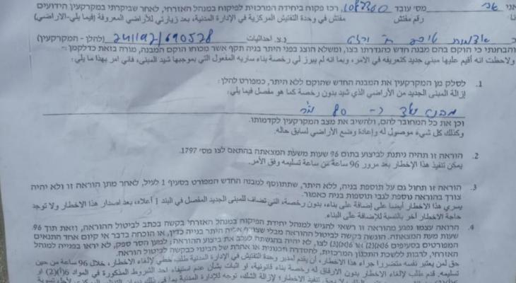 وأوضحت مصادر محلية، بأن الاحتلال أخطر بوقف البناء في أربع غرف زراعية في منطقة "ظهر الرياح" تعود للمواطنين، "رزق شحادة صلاح، ومحمد شحادة صلاح، ومأمون نصري صلاح ، وصلاح شحادة صلاح"، بحجة عدم الترخيص .