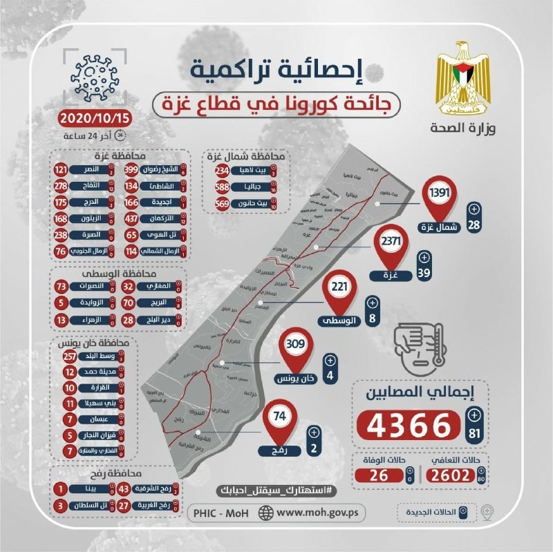 صحة غزة تنشر الخارطة الوبائية لمصابي كورونا اليوم الخميس
