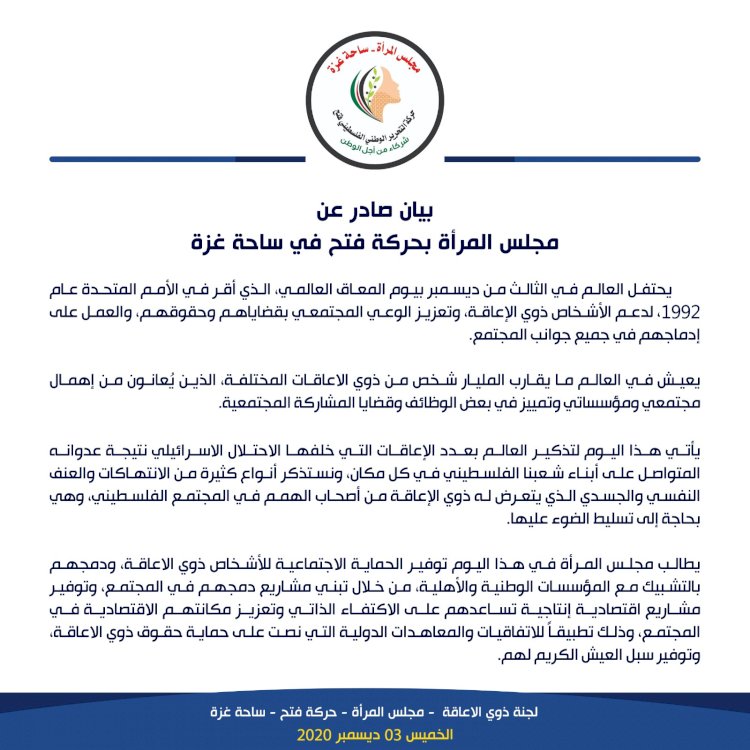 يأتي هذا اليوم لتذكير العالم بعدد الإعاقات التي خلفها الاحتلال الاسرائيلي نتيجة عدوانه المتواصل على أبناء شعبنا الفلسطيني في كل مكان، ونستذكر أنواع كثيرة من الانتهاكات والعنف النفسي والجسدي الذي يتعرض له ذوي الإعاقة من أصحاب الهمم في المجتمع الفلسطيني، وهي بحاجة إلى تسليط الضوء عليها.