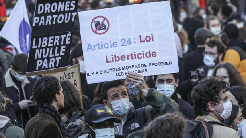 وشارك آلاف الفرنسيين في أنحاء البلاد في مسيرات احتجاجا على عنف الشرطة وطالبوا بحرية الصحافة بعد أن اعتدت الشرطة على رجل أسود، وهو منتج موسيقي، بالضرب مما أذكى موجة غضب على مشروع قانون يُعتقد أنه يقيد حرية الصحفيين في الكشف عن وحشية الشرطة.
