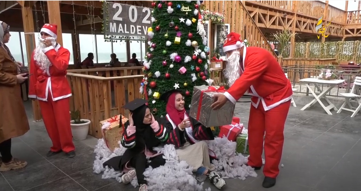 خاص بالفيديو|| عاملا مطعم في غزة يستقبلان الزبائن بزي 'بابانويل'